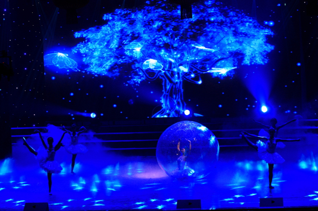 艺术杂技《水晶球芭蕾》,将现代光电科技与舞美设计、服装设计、舞蹈设计一体完美结合,创造出美轮美奂的舞台效果,令舞台上的精彩节目锦上添花。灯光的炫彩变化,配之以活力四射的青春音乐,激发出现场观众的浓烈热情。