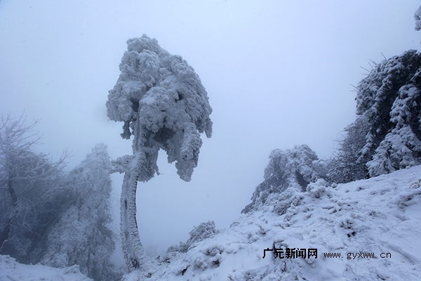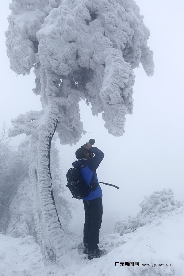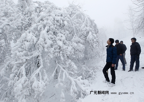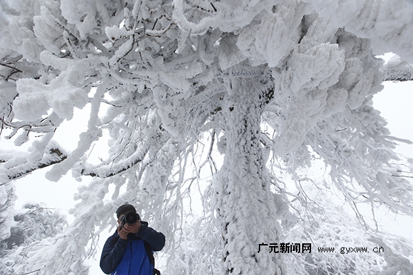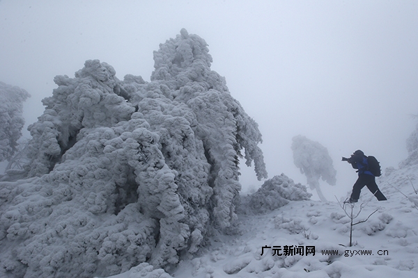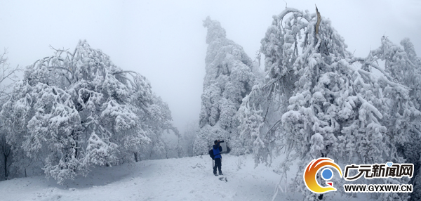 整个山顶被白雪包裹,地面上的积雪达一尺多深,树、藤蔓、灌木、杂草银装素裹,大草甸像偌大的冰雪场,消失在云雾里。记者感觉像进入冰雪童话世界。
