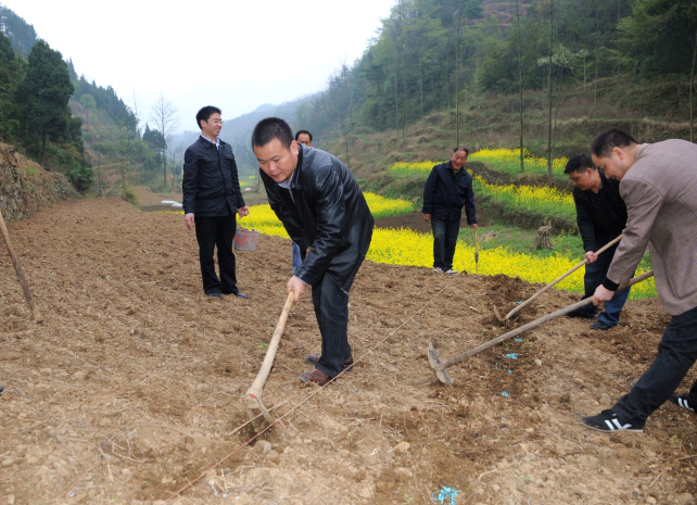 张大鸿与临溪乡干部抡起锄头加入到了群众春播的行列。