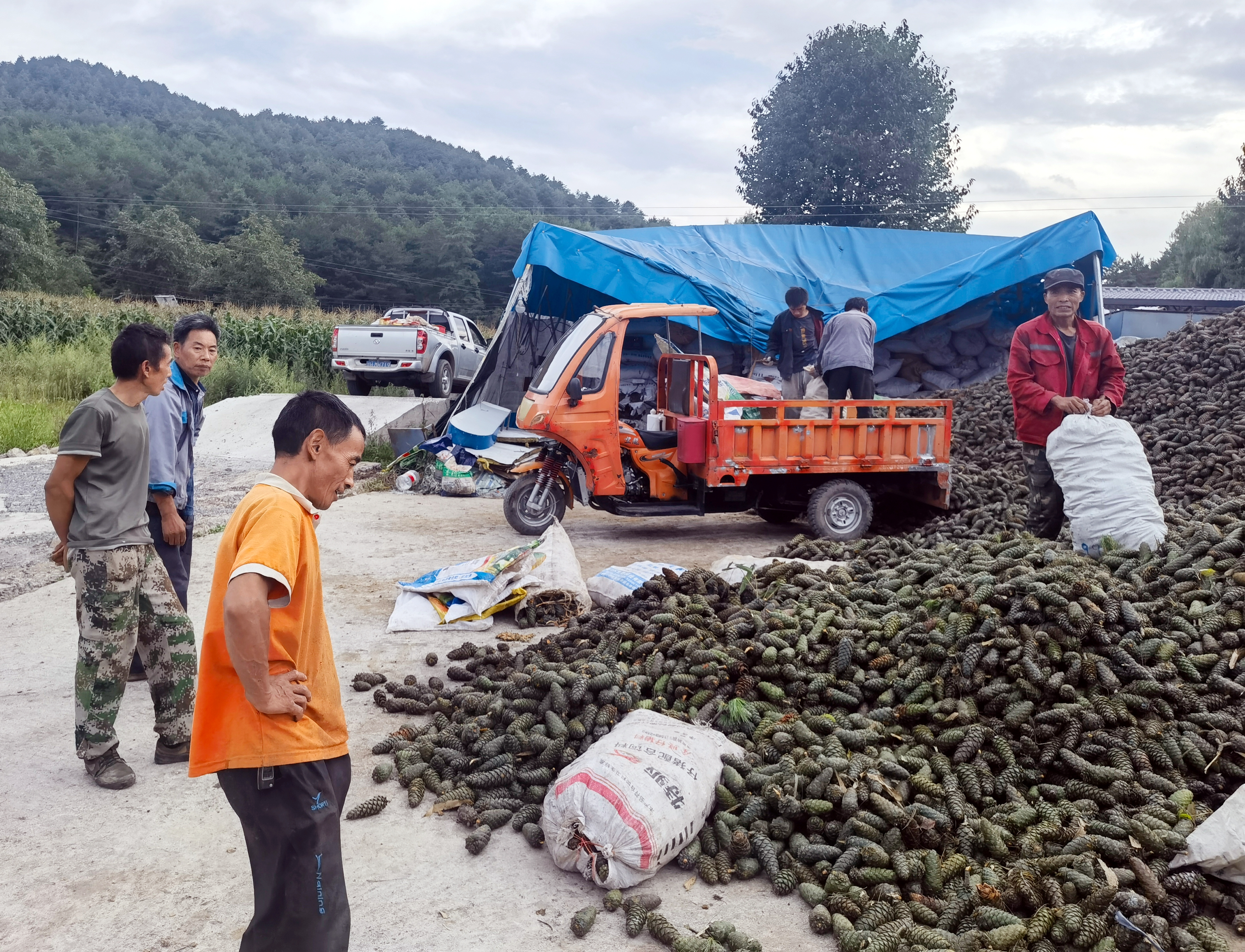 作为曾家山生态核心区域,李家镇拥有38万亩连片华山松林,眼下正迎来一年一度的松塔采收旺季。公路两旁临时搭建的松塔收购点彩旗飘扬,忙得热火朝天。