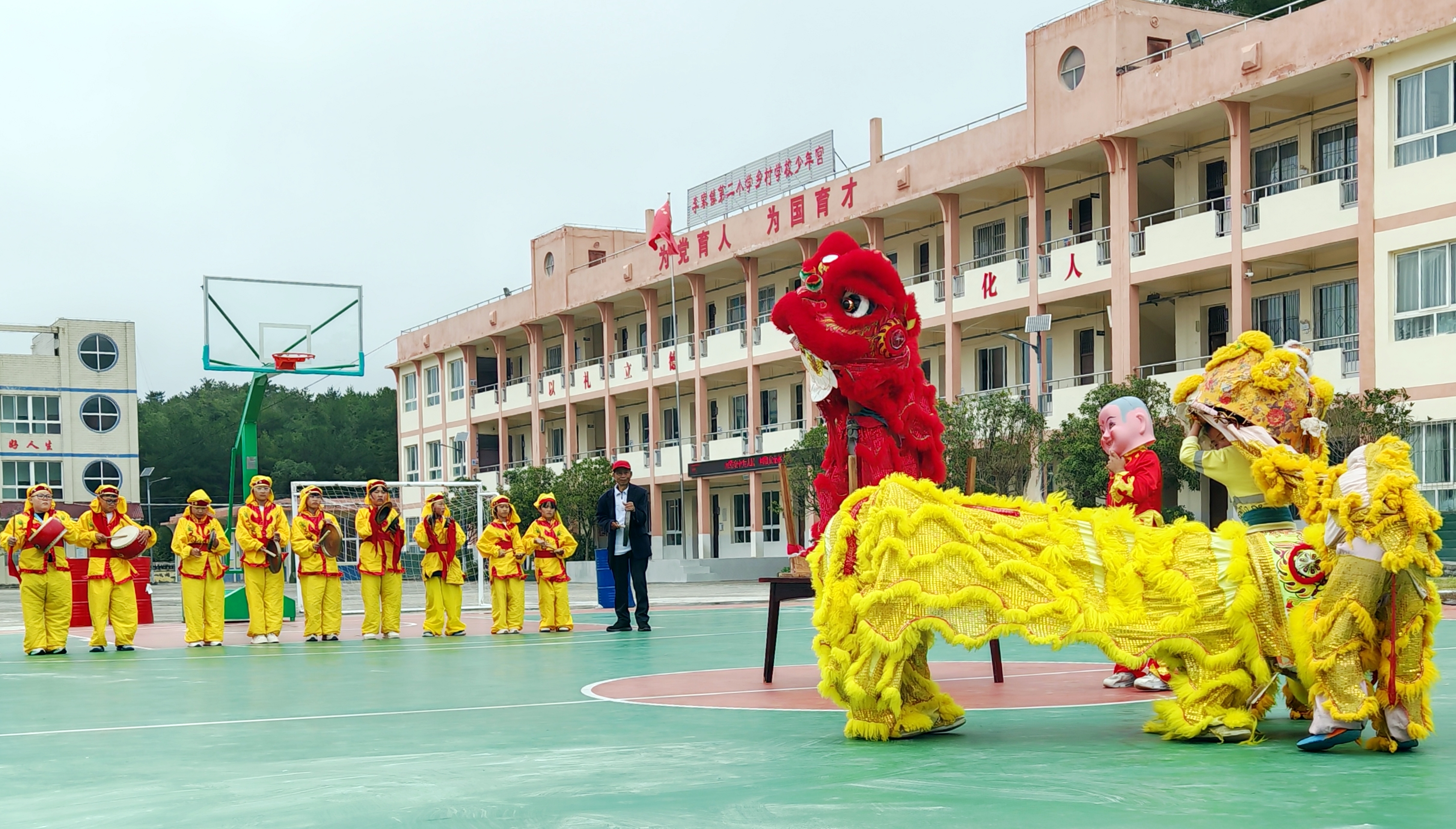 李家镇第二小学的孩子们正在进行狮舞锣鼓表演