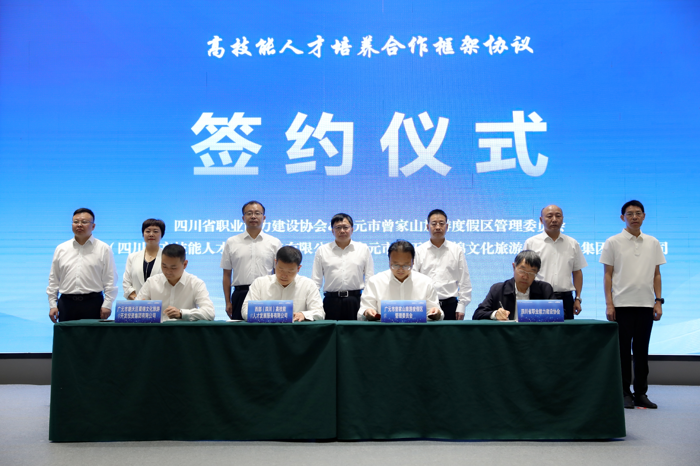 签约仪式上,曾家山旅游度假区管委会、朝天区蜀锦文化旅游开发投资集团有限公司、四川省职业能力建设协会作了发言;曾家山管委会与省职建协会、朝天区旅发集团与西部高技能人才发展公司分别签订了框架协议,覆盖酒店管理、健康照护、养老护理、家政服务等多个大健康产业重点领域,涵盖“订单班”式精准育人、实训基地联合共建、竞赛交流机制创新、技能评价标准互认等多维度合作内容。
